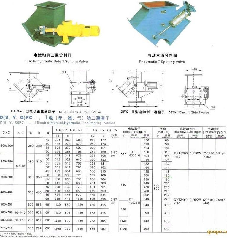 三通分料器別名三通卸灰閥。三通分料器有電液動,電動,氣動,手動等幾種啟動方式,所以又叫電液動三通分料器,電動三通分料器,氣動三通分料器,手動三通分料器??梢灾苯訉⑸喜糠ㄌm接在膠帶機頭部漏斗下或其它設(shè)備下料接口處,其一般用于在堆比重小于等于2.8t/m、且磨琢性較大、工作環(huán)境惡劣的條件下??紤]到其結(jié)構(gòu)尺寸大、重量大(耐磨襯板較厚),上部法蘭無法承受自身重量,使用須根據(jù)實際情況另加支承。